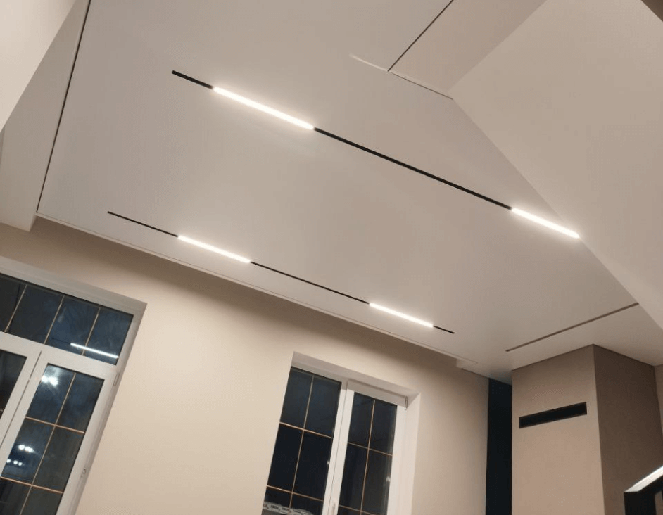 Необычные натяжные потолки со световыми линиями, переходящими на стену! Красиво, оригинально и современно. Рассказываем, показываем, объясняем.